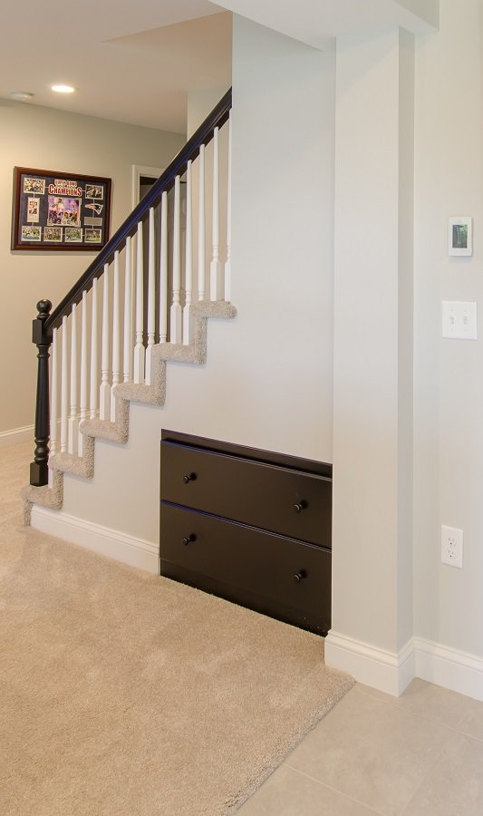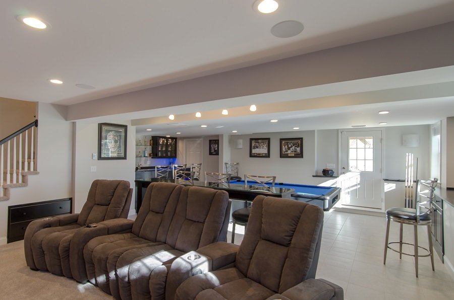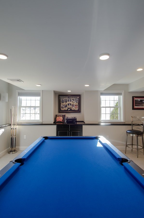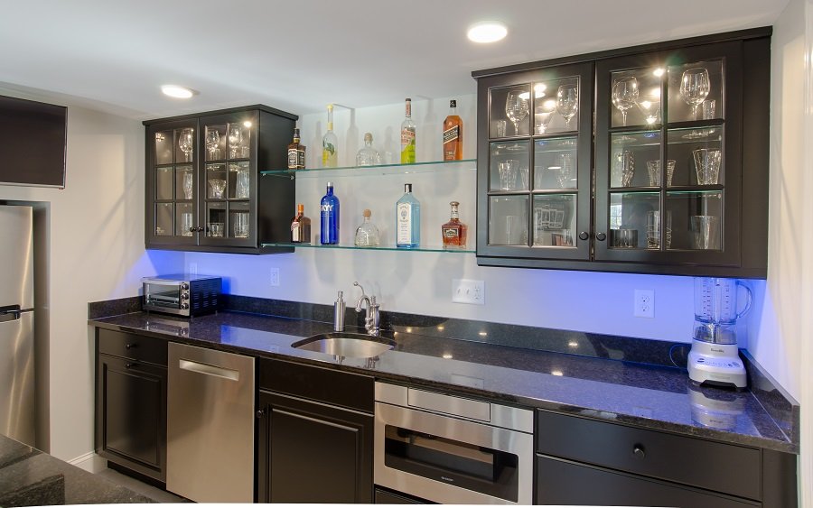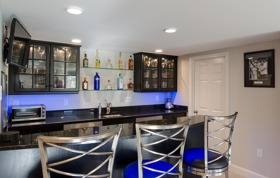 | Pepperell MA Basement Remodel Custom black painted cabinetry with granite countertops and blue lighted accents give this Pepperell MA basement remodel new life. Blue lights surround the TV and below the wall cabinetry compliment the large pool table. Glass wall cabinets are perfect for wine glasses and other decrotive liquor glasses Glass shelves between the wall cabinets is a great way to display expensive liquors. Bar sink and dishwasher provide a great place for washing glasses without bringing them upstairs to the main kitchen. The fridge recessed into the wall is a great place to store cold beverages as well as snacks for the big game! Seating area at the bar is a great place for company to sit and chat while someone makes drinks Bar area over by the TV made out the black cabinetry and granite countertop provides a table like seating for those trying to eat and watch TV but also provides a great place to lay out food while entertaining in this Pepperell MA basement remodel Built in entertainment center under the TV is a great place to store DVDs and the cable box without being in the way. |