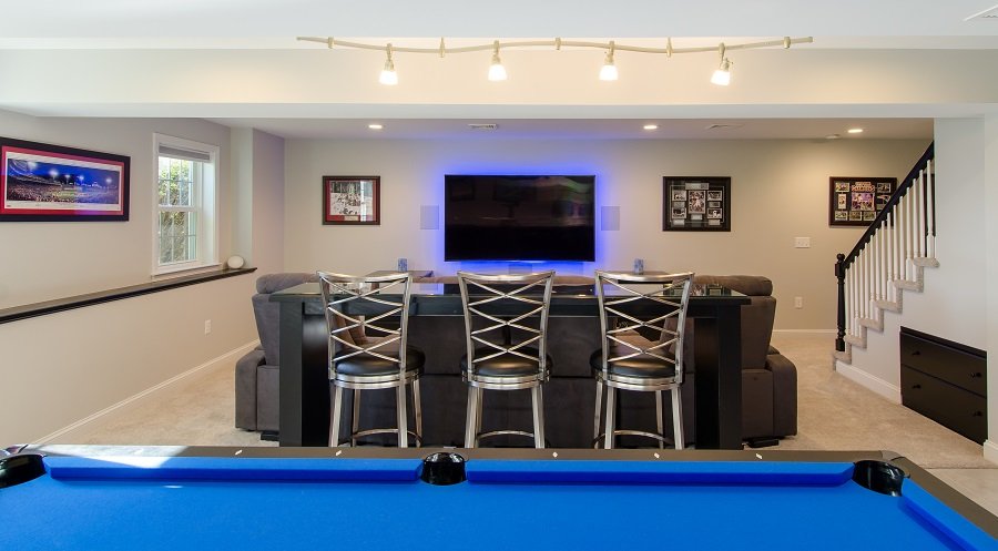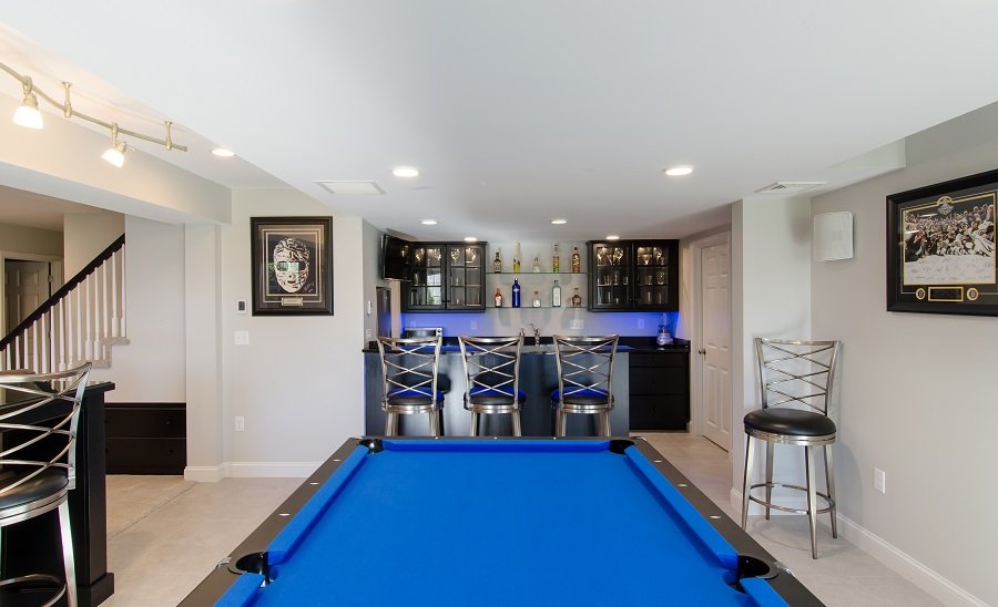 | In summary – Black cabinetry and granite countertops create the perfect man cave in this Pepperell MA basement remodel. Blue accent lights below the wall cabinetry and around the TV compliment the pool table. Glass wall cabinets are a great way to show off fancy wine glasses and mugs. Appliances such as a fridge, microwave, sink and dishwasher make this space very practical and usable. Custom entertainment center created out of the same cabinetry as the bar tie this Pepperell MA basement remodel space all together. |