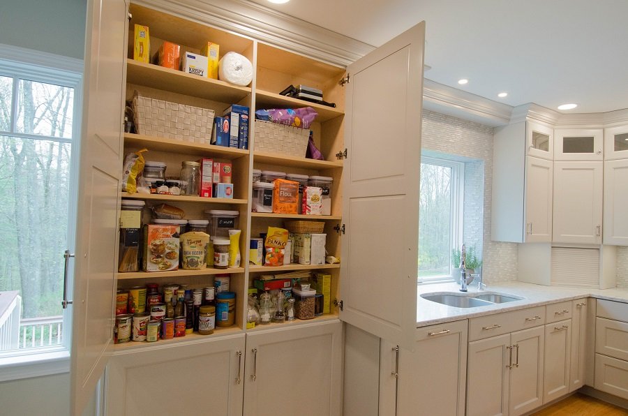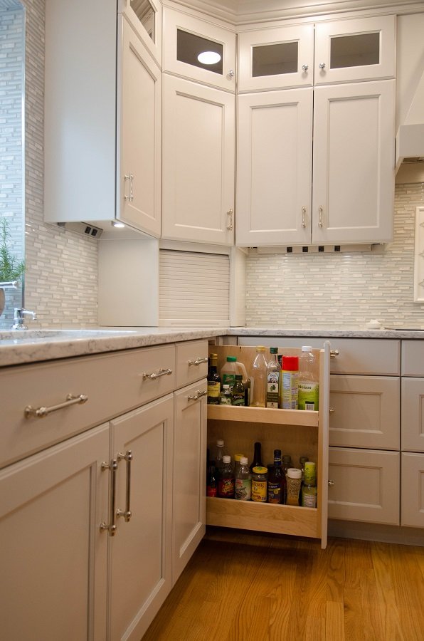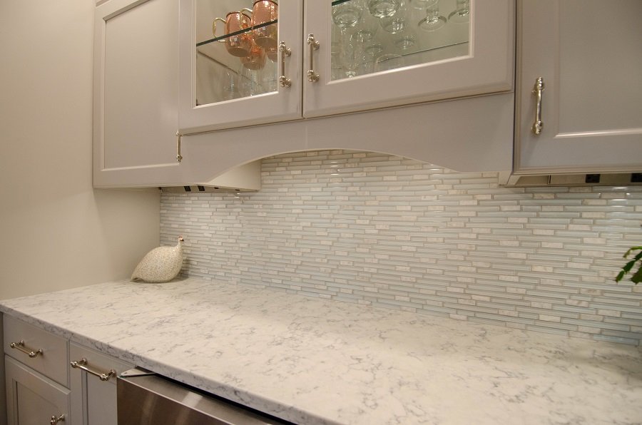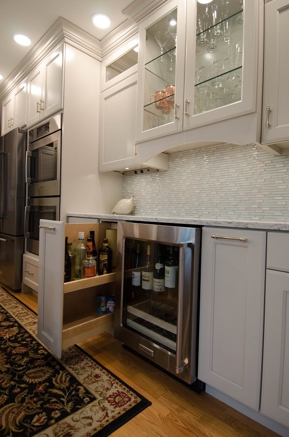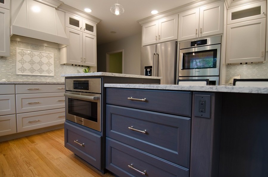 | In summary – Two toned cabinetry with stainless steel appliances, large island with seating and a stunning powder room really make this remodel in Bedford NH one of a kind. |