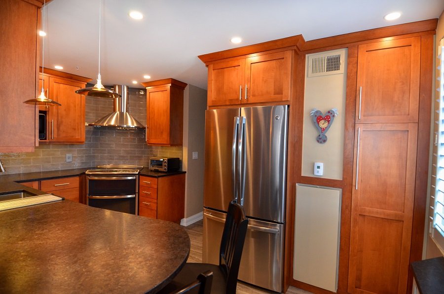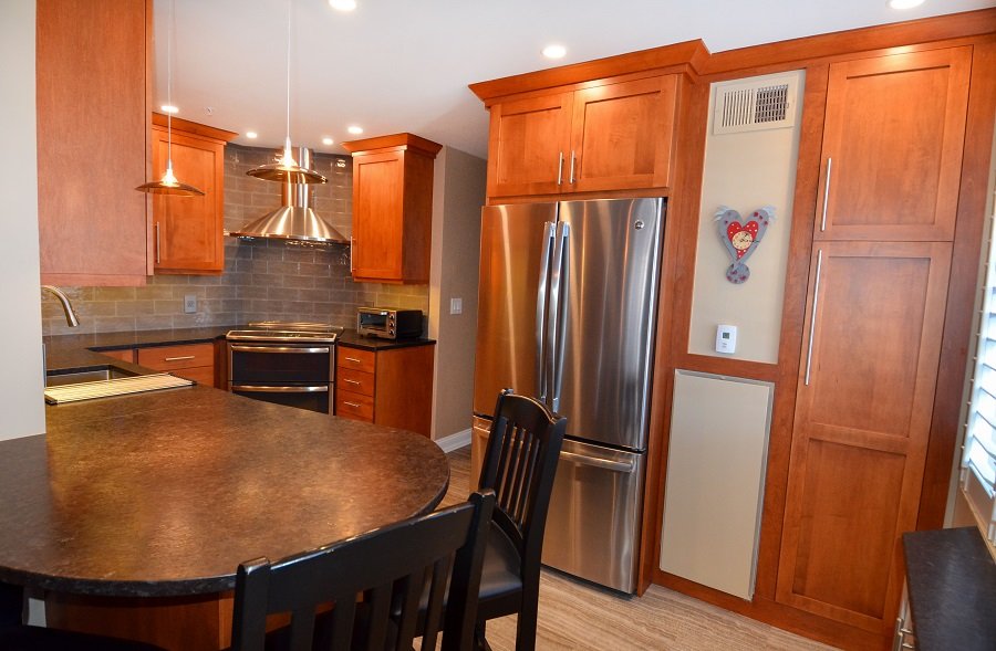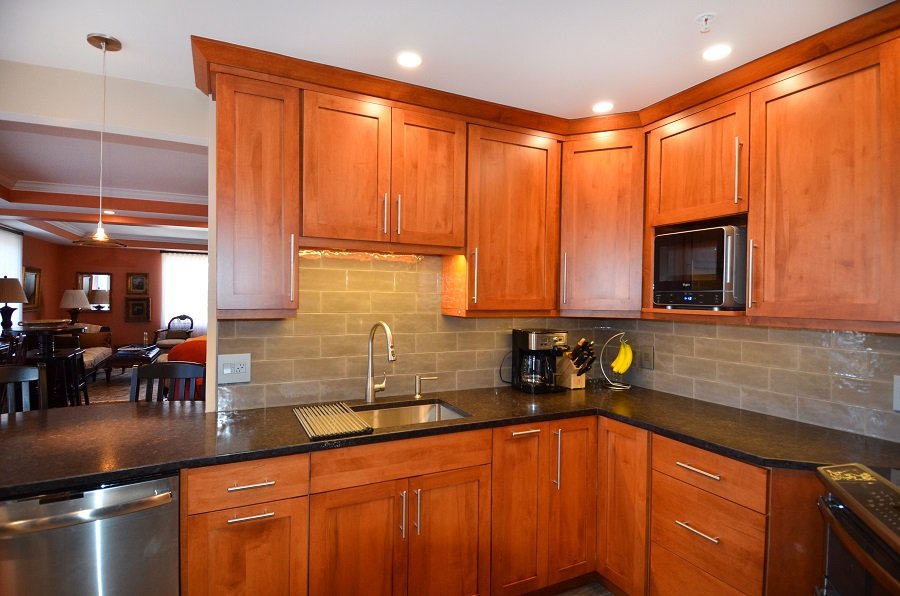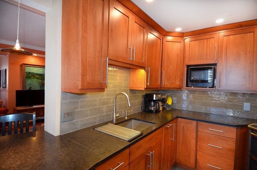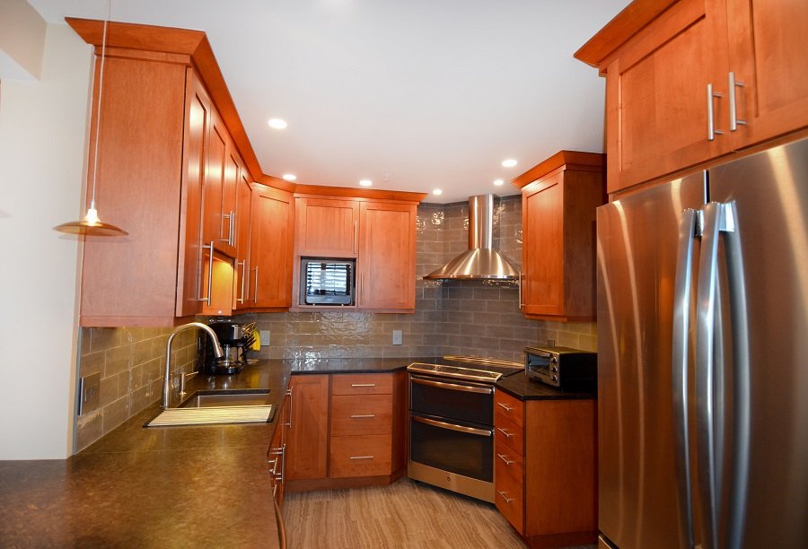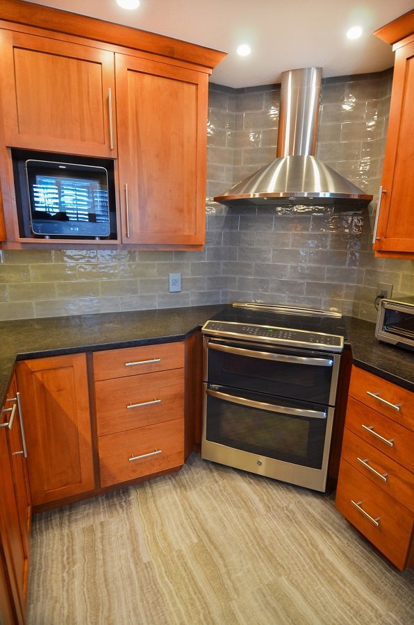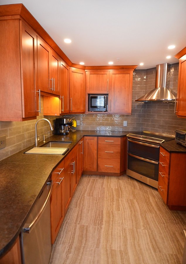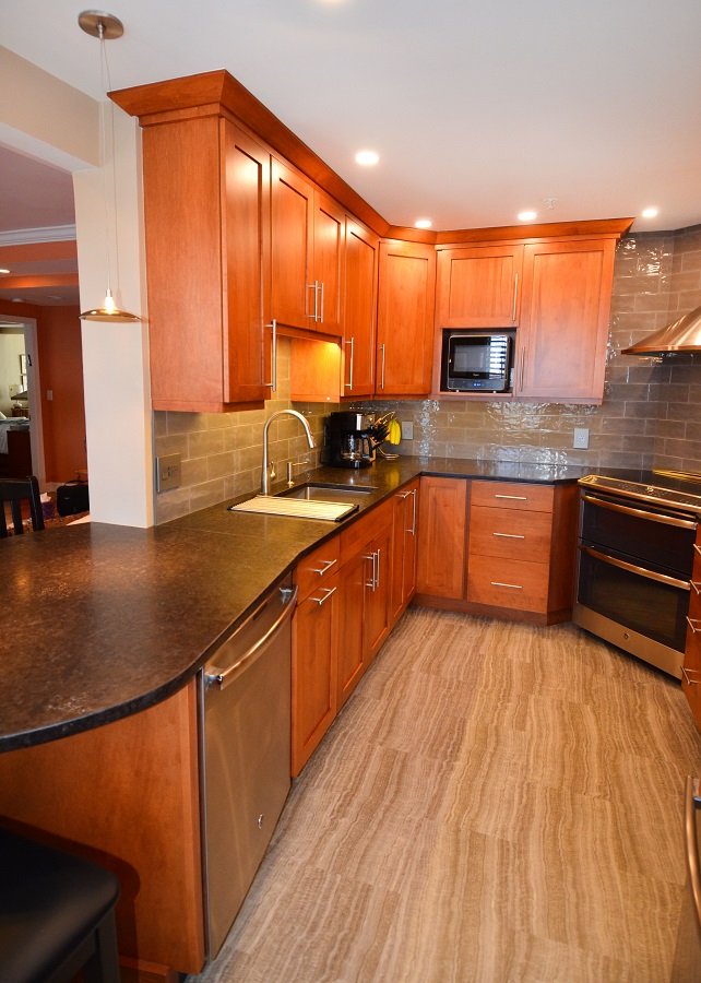 In this newly renovated cherry kitchen remodel, Boston MA the natural cherry and gray accents throughout the kitchen interlaces wonderfully in the kitchen design. From the floor to the ceiling the colors interact with one another in a unified style. The honed countertops stretch throughout the perimeter of the small kitchen remodel into a circular seating area at the end comfortable seating four. The Stainless steel sink is plenty deep enough to fit large pots and pans to clean. It also has a magnetic drying rack that attaches and detaches when you need it. The microwave fits in the cabinet space just perfectly and is the right size for a family of two. The double oven and fridge are new and match the rest of the stainless steel appliances. There is plenty of storage space and tall pantry cabinets to hold all the homeowners pantry needs. The lighting weaves throughout the kitchen remodel from recessed lighting to backslash lighting. The floor is a new durable vinyl that holds up in harsh New England climates. It’s stunning and adds to the unique style kitchen remodel in Boston Ma.