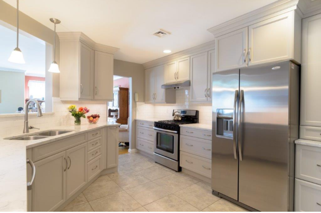 - Small area made to look bigger with bright white cabinets