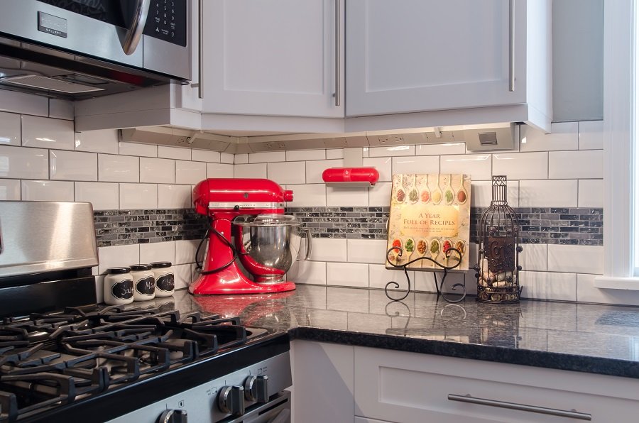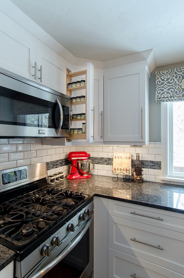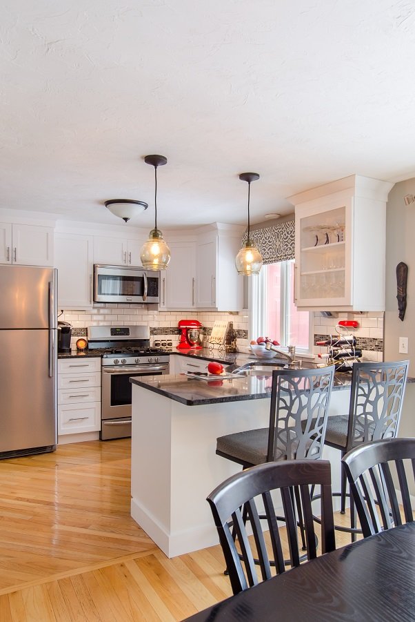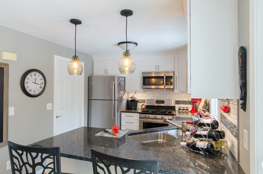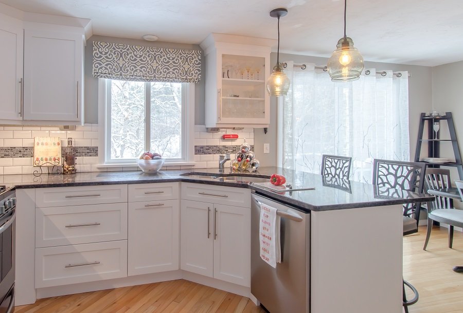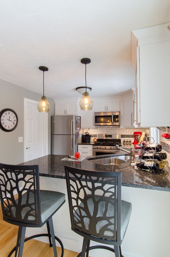 | Tewksbury MA Kitchen Remodel White cabinetry and dark granite give Tewksbury MA kitchen remodel great contrast and makes this small kitchen look larger. Putting the sink in the corner allows the cook to still be park of conversation while being in the kitchen space. Lots of drawer storage added to kitchen with organization for spatulas and spices so everything has a place. Plenty of cabinet storage for pots, pans, mixing bowls, Tupperware, serving dishes, small appliances and anything else the owner could need. Small peninsula with seating for two is a great place to have coffee in the morning or have a glass of wine in this Tewksbury MA kitchen remodel Stunning simple backsplash tile with a dark accent compliments the cabinetry and countertops Wall cabinet with glass is perfect for displaying wine glasses or china in this. |