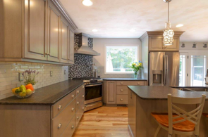 This large traditional kitchen remodel is a homeowner’s dream! A large island, gorgeous backsplash, chandelier…and more. Take a look at the pictures below and contact us today to start designing your dream kitchen.